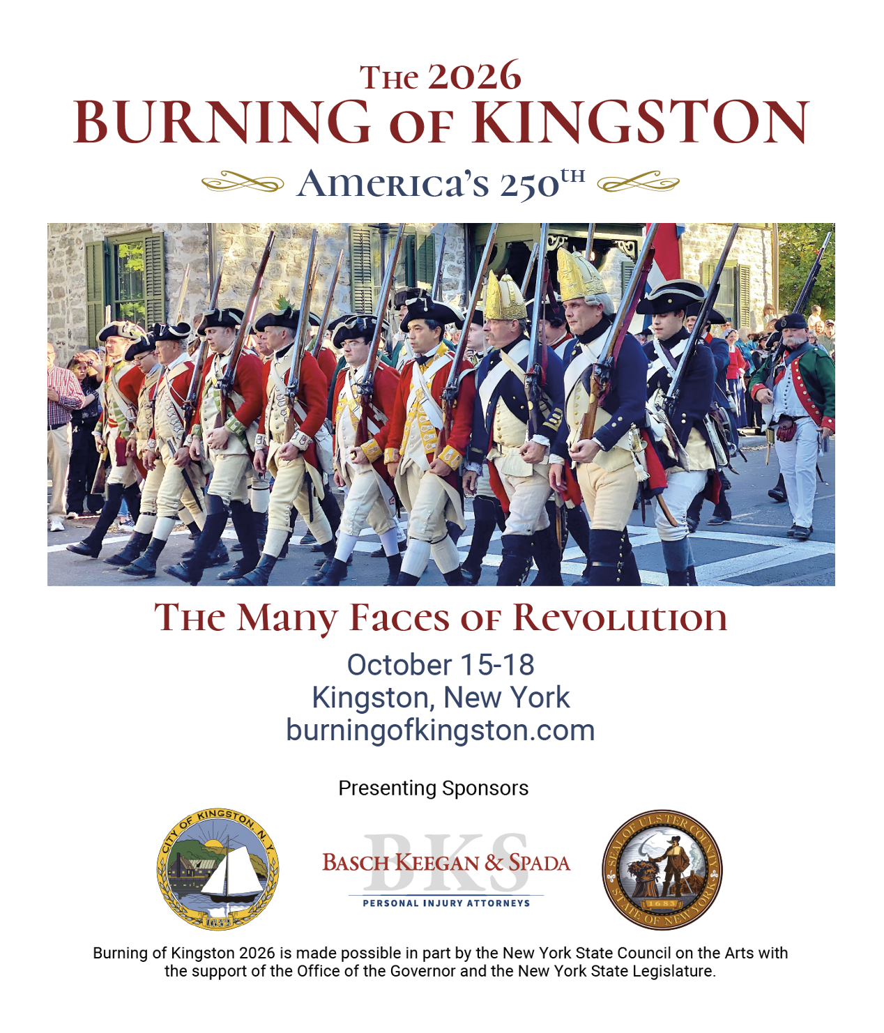 The 2026 Burning of Kingston takes place three months after the 250th anniversary of the signing of the American colonies’ Declaration of Independence in 1776, from October 15-18th in Kingston New York. In our exploration of this remarkable time in our nation’s history, events at this year’s Burning of Kingston will showcase the perspectives of the many faces involved in the Revolution. This includes points of view of combatants from all sides, civilians, indigenous peoples, enslaved peoples and indentured servants, as well as the unique perspectives of women, the elderly, children and people of different classes and trades. We will also include the cultural context of the Revolutionary Period, including its music, art, literature and crafts. This year’s Burning program hosts stories, performances, re-enactments, film-screenings, public displays, a grand ball and more, showcasing the life and times of the Revolution, how it impacted the Kingston community, and beyond. Visitors to this year's Burning of Kingston can expect to be entertained, informed, and encouraged to look at events from 250 years ago in new and unique ways as well as more familiar interpretations. It is free and open to the public.